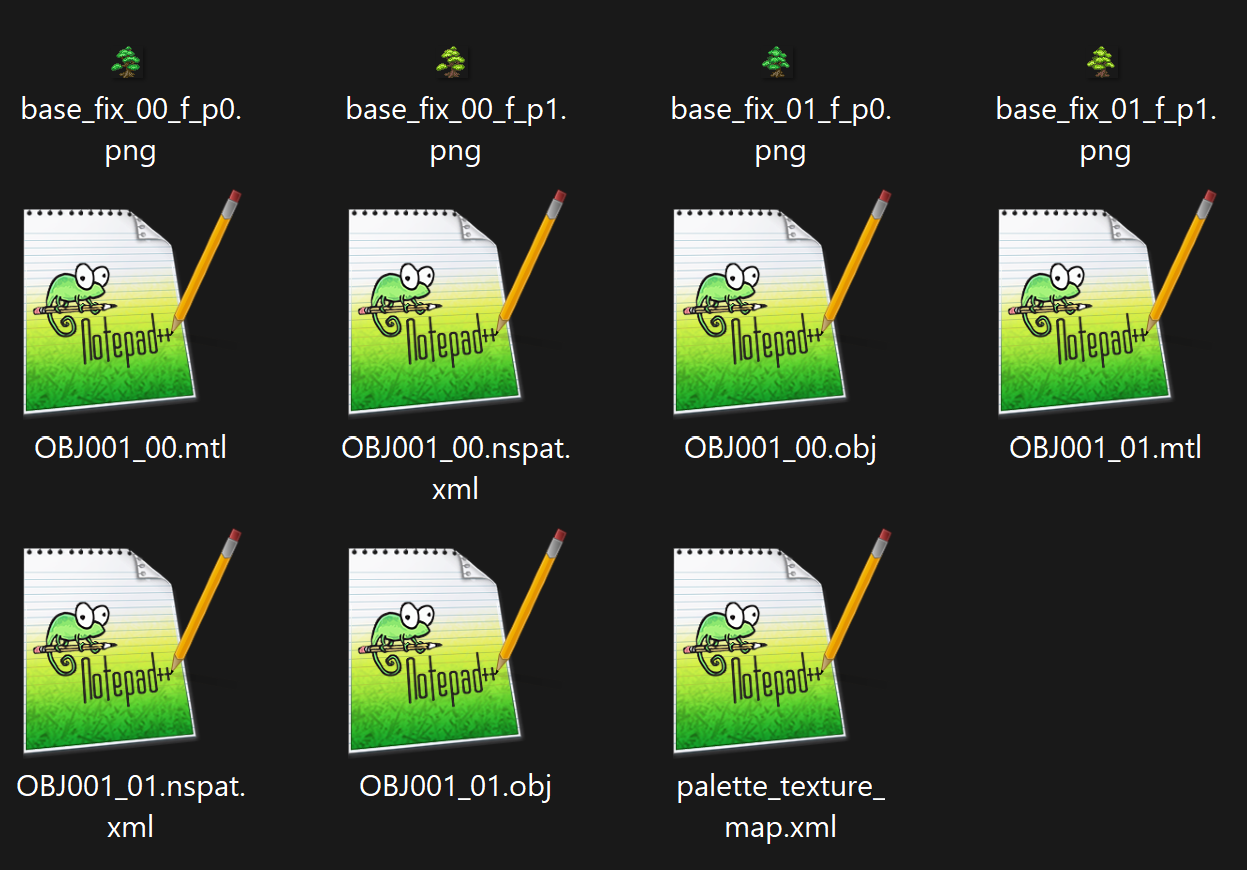 - png: The textures used by the model, per-variant and per-palette. These are what we will be editing.
